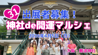 出展者募集 第31回 神社de開運マルシェ in 難波神社 出展募集開始 大阪の難波神社で開催される癒しイベントです。 各種占い、ヒーリング、物販など癒しのプロが集まります。 ぜひ、一緒にマルシェを楽しみませんか? 出展者様を募集中です。 2025.10.14 出展者募集